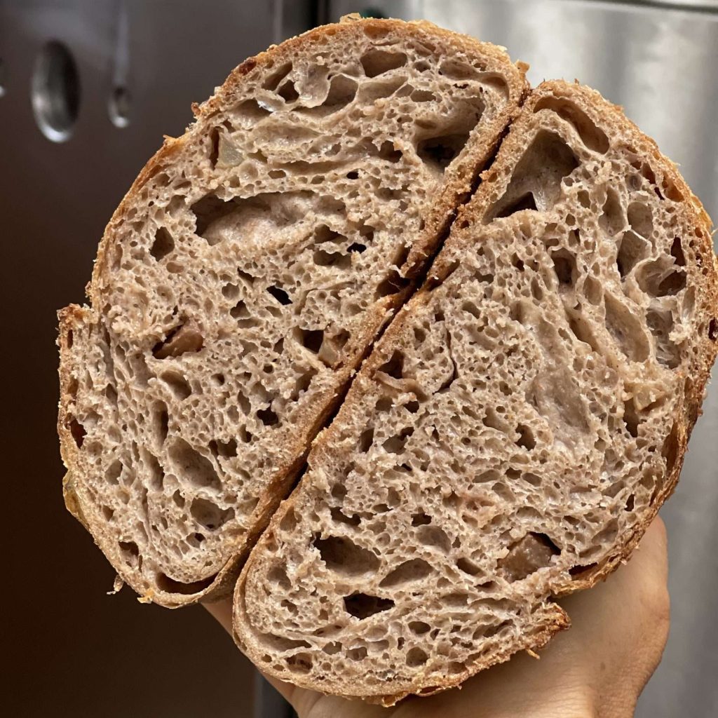 Stone baked and naturally leavened for over 36 hours with a whole wheat sourdough starter. Ingredients are simply a whole wheat, white wheat and spelt organic flour blend , slow roasted apple pieces , cinnamon, filtered water and sea salt . Soft, airy and light crumb with a crunchy crust. This loaf comes with the option of being sliced and in a brown paper bag. It freezes well or will keep fresh for three to four days in a linen bag, sealed container or wrap.