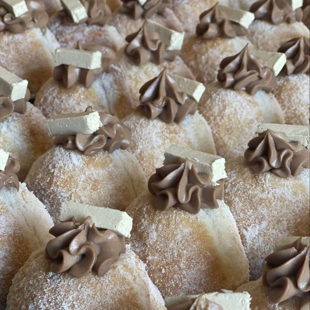 This one is filled with a hand made chocolate creme patisserie that is taken to the next level with the flaky, rich, nutty, sweetness of sesame halva and swirls of raw tahini. Our sourdough doughnuts are carefully and generously filled to ensure that the rich, creamy and chocolatey deliciousness is present in every bite!