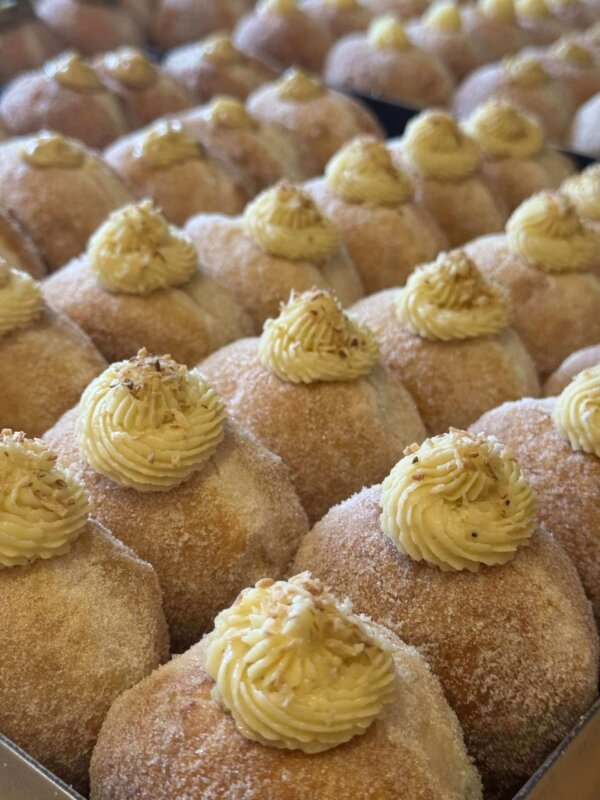 Hand crafted using in house freshly made coconut cream and only good quality natural ingredients, this aromatic and rich creme patisserie has no artificial preservatives or additives. Our sourdough doughnuts are carefully and generously filled to ensure that the coconut with a tropical edge is felt in every bite!