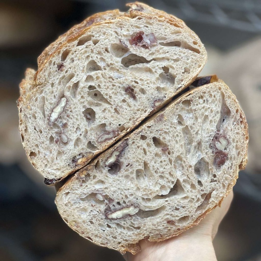 This sourdough loaf is packed full of juicy cranberries and roasted pecans. A flavour combination that works equally well with cooked meats or sweet treats. It’s very popular around Thanksgiving time, gracing many tables of those who celebrate.