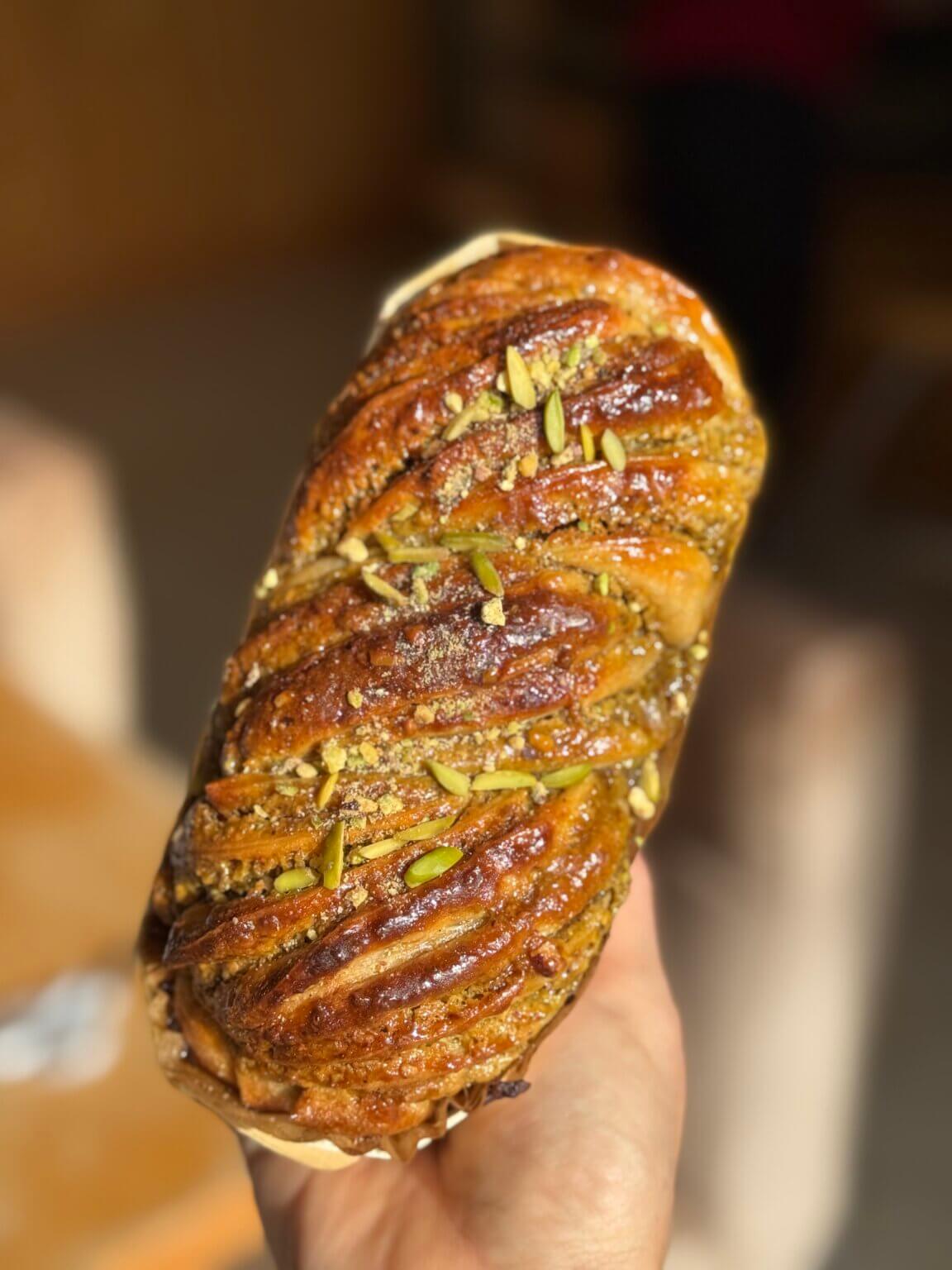 Artfully twisted enriched sourdough, that has been fully fermented for over 36 hours.  This one is filled with an in house made pistachio butter.  Dairy free and made with all natural ingredients. No margarine in sight! These freeze very well or will keep fresh for four to five days in a sealed container or wrap.
