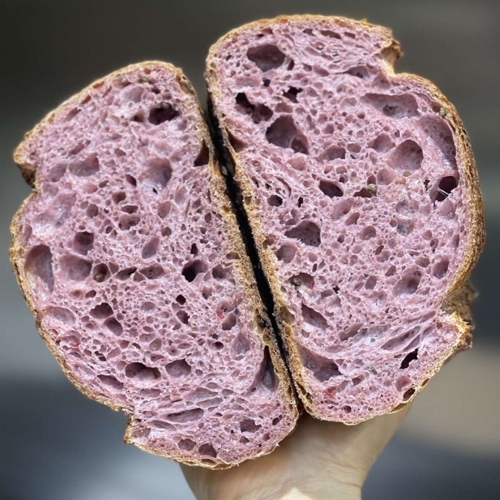 Purple sweet potatoes are a good source of beta-carotene and anthocyanin pigments, containing about 3 times more anthocyanins than the average blueberry!, Mashed and gently folded into the dough, they impart a slight floral note and give the loaf a super soft crumb. Due to the seasonal availability of purple sweet potatoes, this loaf is only made at certain times of the year.