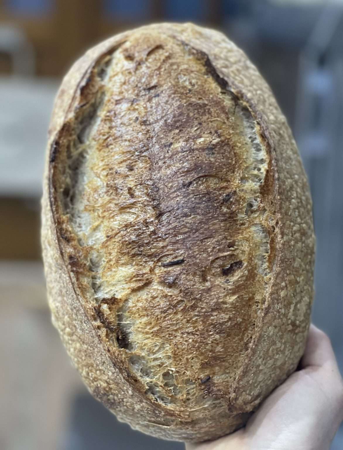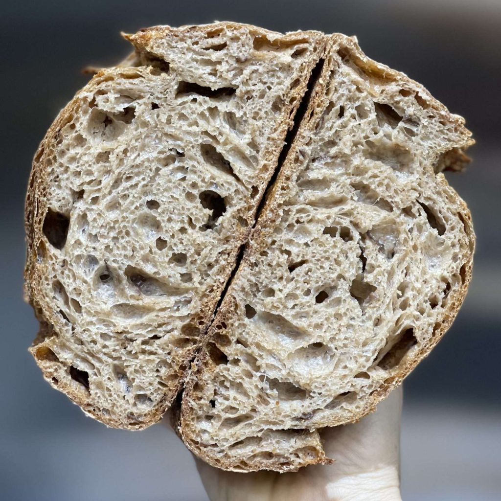 Stone baked with 100% organic ingredients. Naturally leavened for over 36 hours with a whole wheat sourdough starter. Ingredients are simply a whole wheat, white wheat and spelt flour blend , slow roasted onions, extra virgin olive oil, filtered water and sea salt . Soft, airy and light crumb with a crunchy crust. This loaf comes with the option of being sliced and in a brown paper bag. It freezes well or will keep fresh for three to four days in a linen bag, sealed container or wrap.