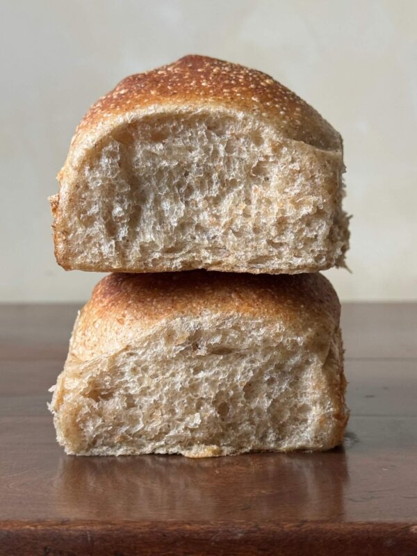 These vegan, pull apart style sourdough rolls are soft and fluffy with just a touch of sweetness. Â Slowly fermented for over 36 hours, they are made with organic whole and white wheat flour, and are light and flavoursome, with a soft, golden crust. Best eaten on the day they are baked, or freshly frozen. Perfect for the kids lunch boxes. I often freeze a load, and pop a frozen one into their bags in the morning. They’re perfectly defrosted by lunch time.