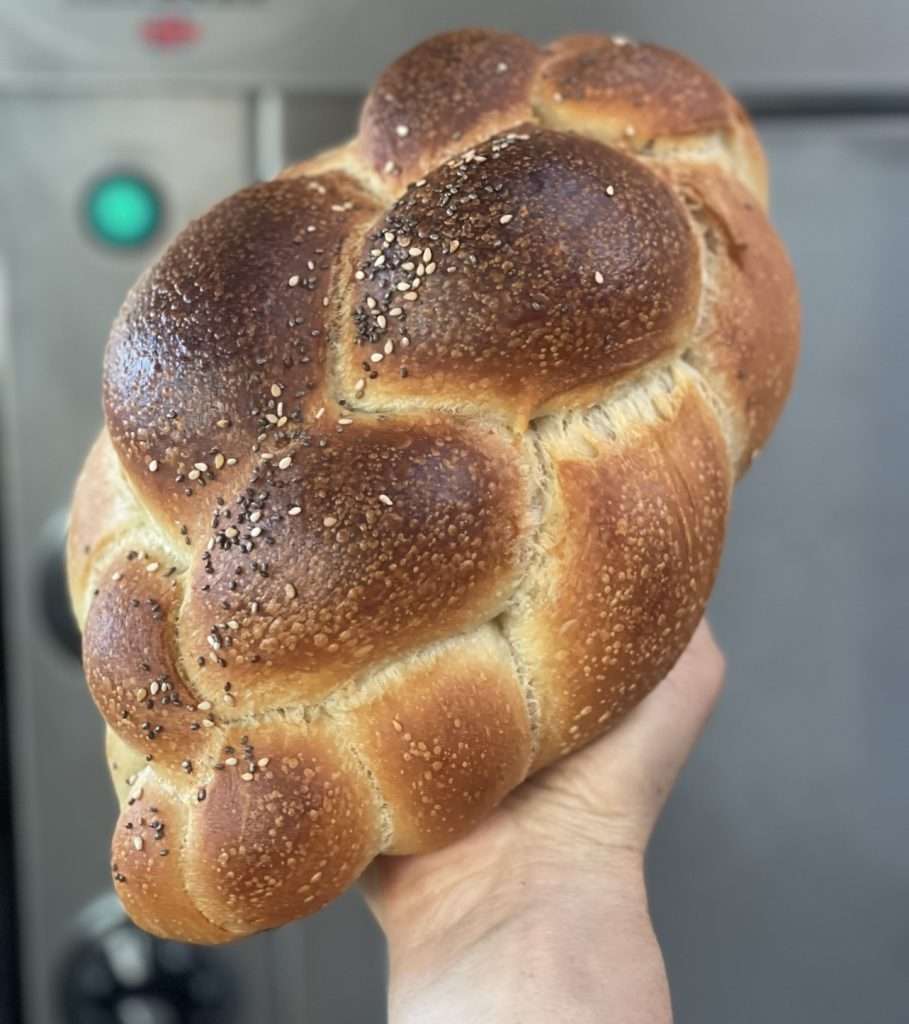 Artfully braided with six strands, these sourdough challahs are wholesome and dairy free. Made with all natural ingredients and organic flour, the very subtly sweetened enriched dough is fully and slowly fermented for over 36 hours. They are all hand crafted and a true labour of love.  With an airy crumb, pillowy soft texture, a deep golden crust and a wonderful flavour profile,  these sourdough challahs have become very popular in my neck of the woods.