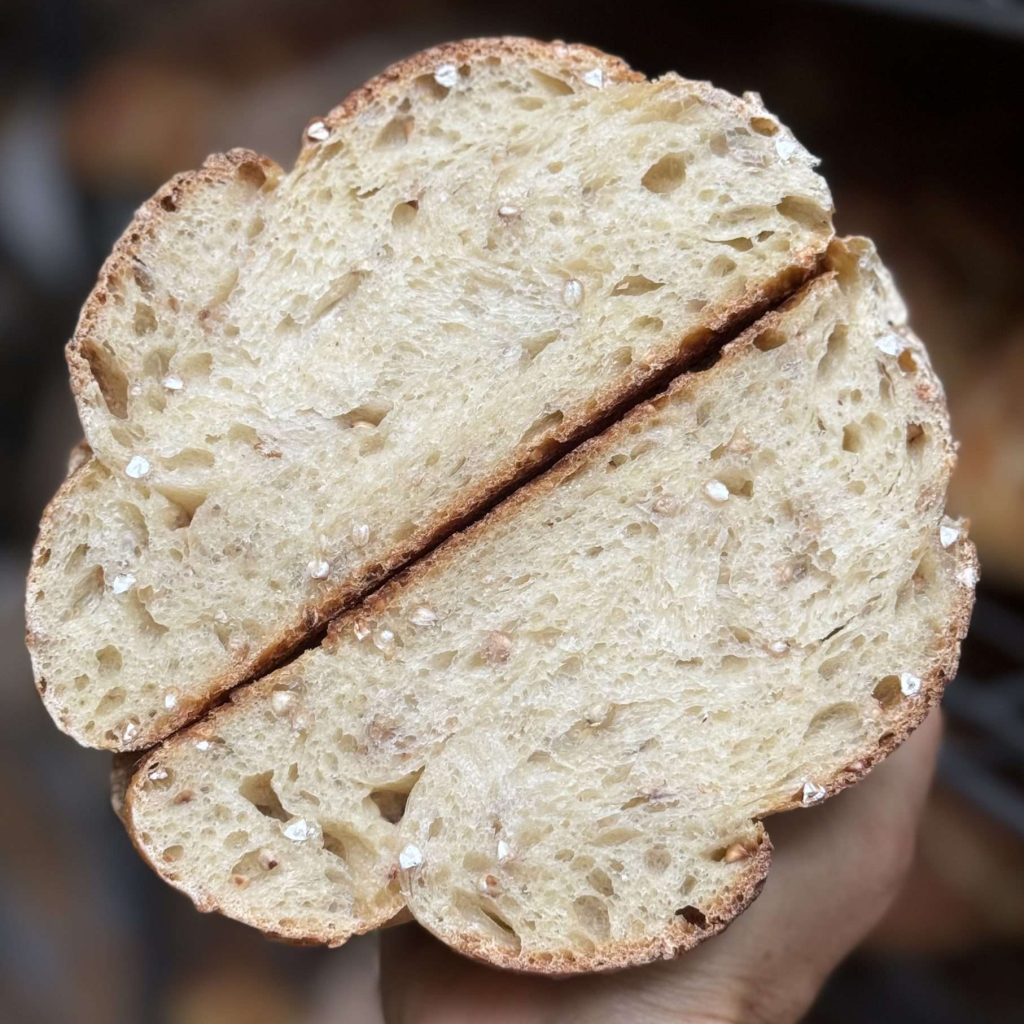 Organic buckwheat groats are soaked in filtered water and allowed to germinate before being gently folded into the dough. During the sprouting process, the enzymes in the buckwheat are activated, which increases the levels of vitamins, minerals and antioxidants that are bioavailable. Digestion and absorption are consequently much easier for our bodies. Sprouted buckwheat has a subtly nutty and creamy taste, adds a delicate crunch and wonderful softness to the crumb. This is a special loaf, that is a popular addition to the menu.
