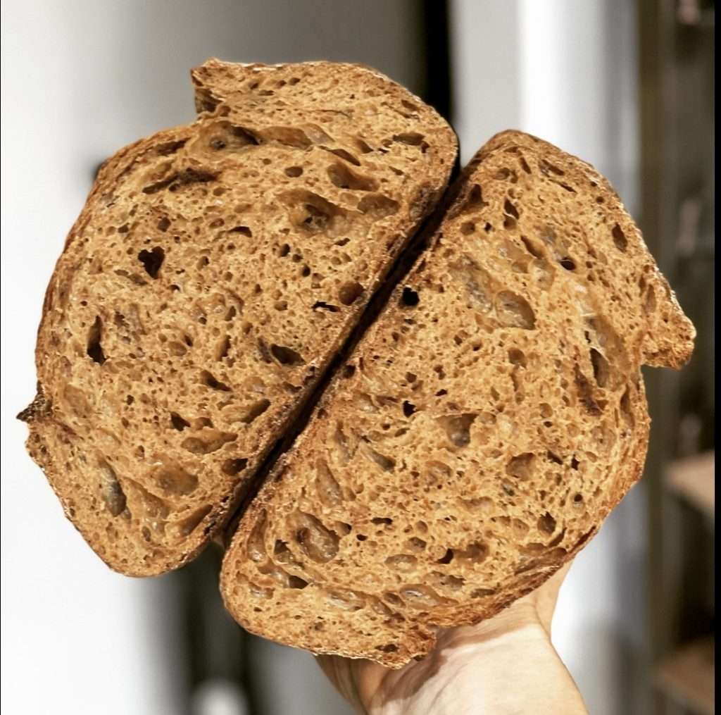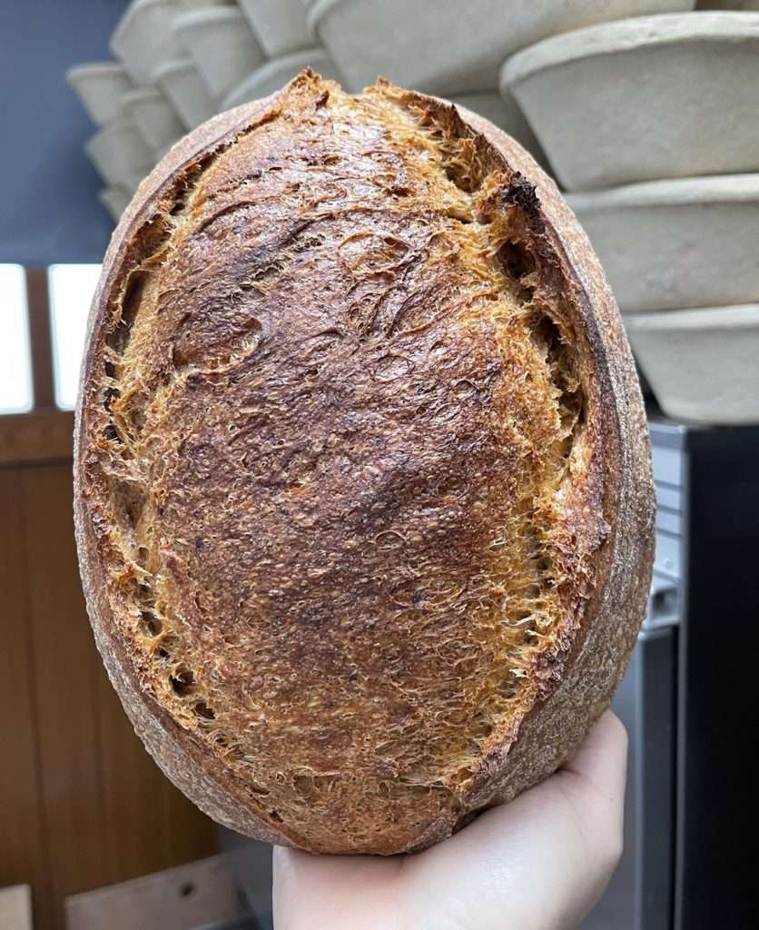 Stone baked and naturally leavened for over 36 hours with a whole wheat sourdough starter. Ingredients are simply a whole wheat, white wheat and spelt organic flour blend , in house marinated sun dried tomatoes , filtered water and sea salt . Soft, airy and light crumb with a crunchy crust. This loaf comes with the option of being sliced and in a brown paper bag. It freezes well or will keep fresh for three to four days in a linen bag, sealed container or wrap.