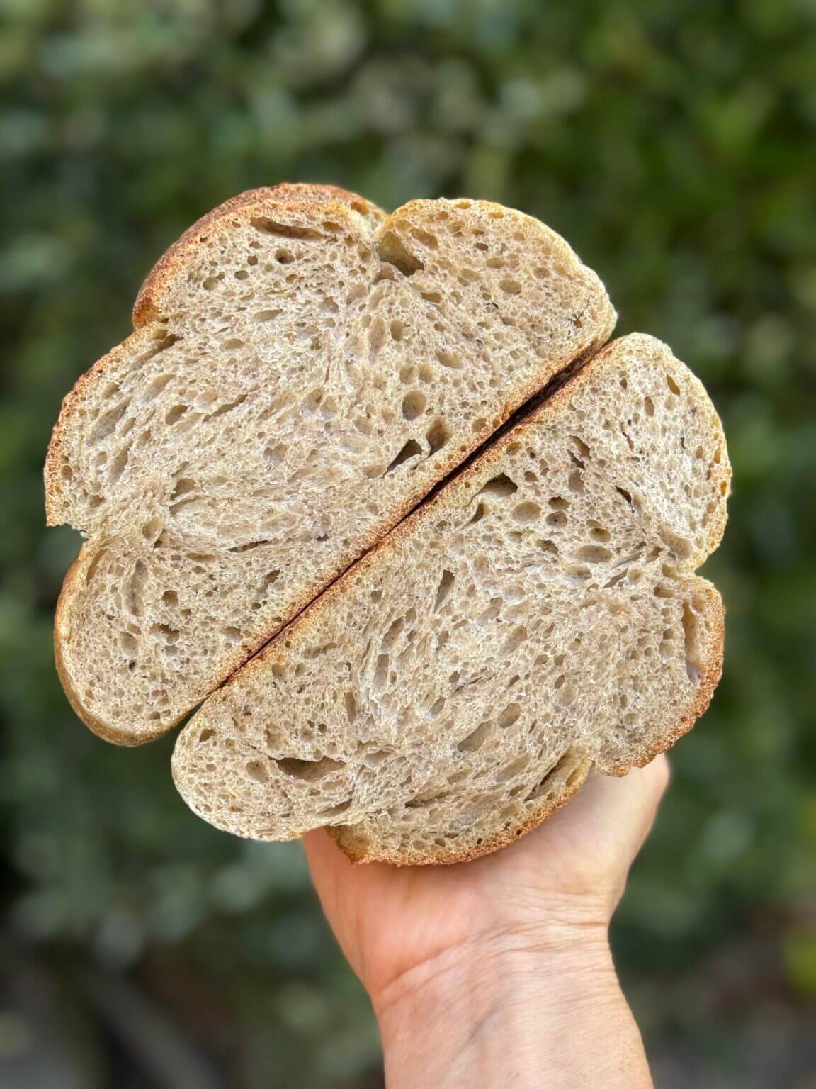 Artfully braided with six strands, these sourdough challahs are wholesome and dairy free. Made with all natural ingredients and organic flour, the very subtly sweetened enriched dough is fully and slowly fermented for over 36 hours. They are all hand crafted and a true labour of love. With an airy crumb, pillowy soft texture, a deep golden, egg washed crust and a wonderful flavour profile, these sourdough challahs have become very popular in my neck of the woods.