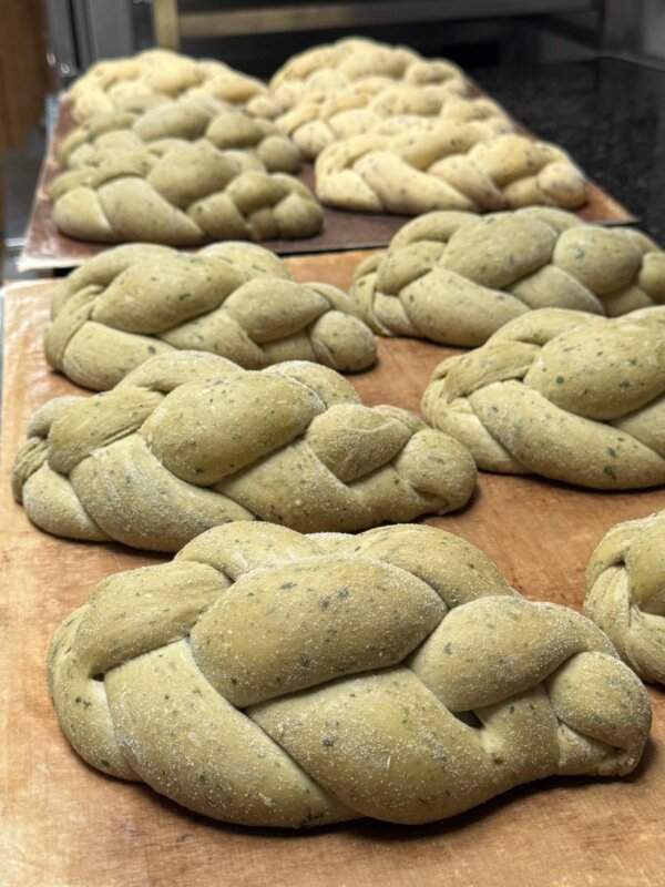 Brimming with fresh flavour, our walnut pesto is made in house with the finest ingredients. Roasted walnuts, fresh basil, fresh garlic, sea salt flakes and extra virgin oil, all finely blended together and then folded into the challah dough.